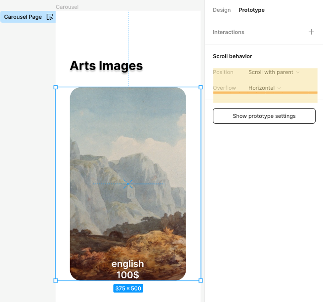 - ③ 슬라이드 프레임에 프로토타입 패널에서 Scroll behavior, Horizontal 추가