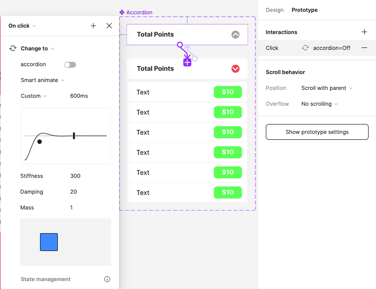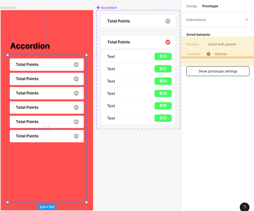- ④ 어코디언프레임에 프로토타입 패널에서 Scroll behavior, vertical 추가